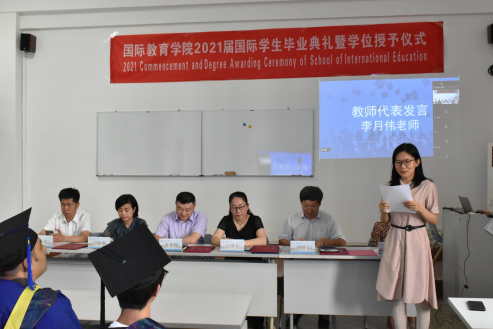 李月伟老师作为教师代表发言,衷心希望国际毕业生们在未来的道路上不断丰富充实自己,掌握过硬的知识和本领,信心百倍地迎接明天的挑战!祝愿每一位毕业生在今后的生活道路上走得坚定、踏实、铿锵、辉煌!