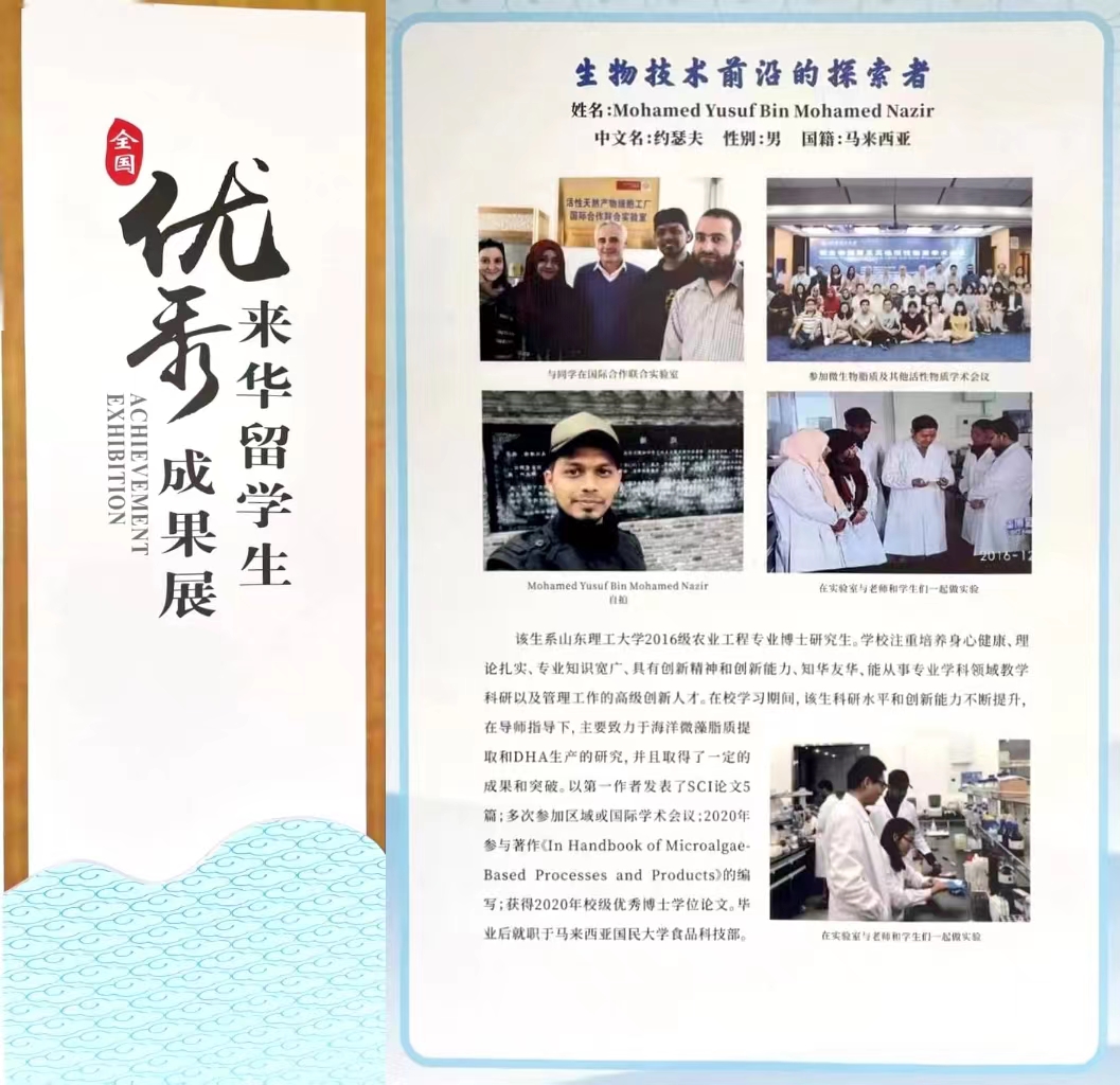 2023年4月8日,中国高等教育学会外国职工教育管理分会在重庆高博会期间举办的“新时代国际员工教育高质量发展论坛—优秀来华职工成果展”中,公司2016级农业工程专业马来西亚籍博士研究生约瑟夫(Mohamed Yusuf Bin Mohamed Nazir)的优秀事迹入选。