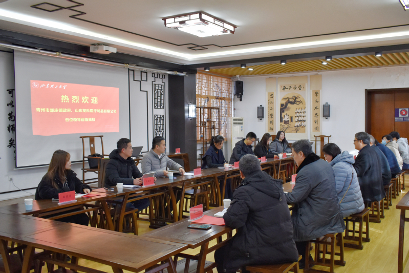 12月20日下午,青州市邵庄镇政府人大主席王晓晴、副镇长孙宁昆、山东英科医疗制品有限公司人力资源部经理张培发等一行8人来公司洽谈政产学研合作和国际人才联合培养事宜。